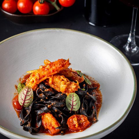 Fettuccini pasta with tiger prawns cooked in spicy black ink sauce