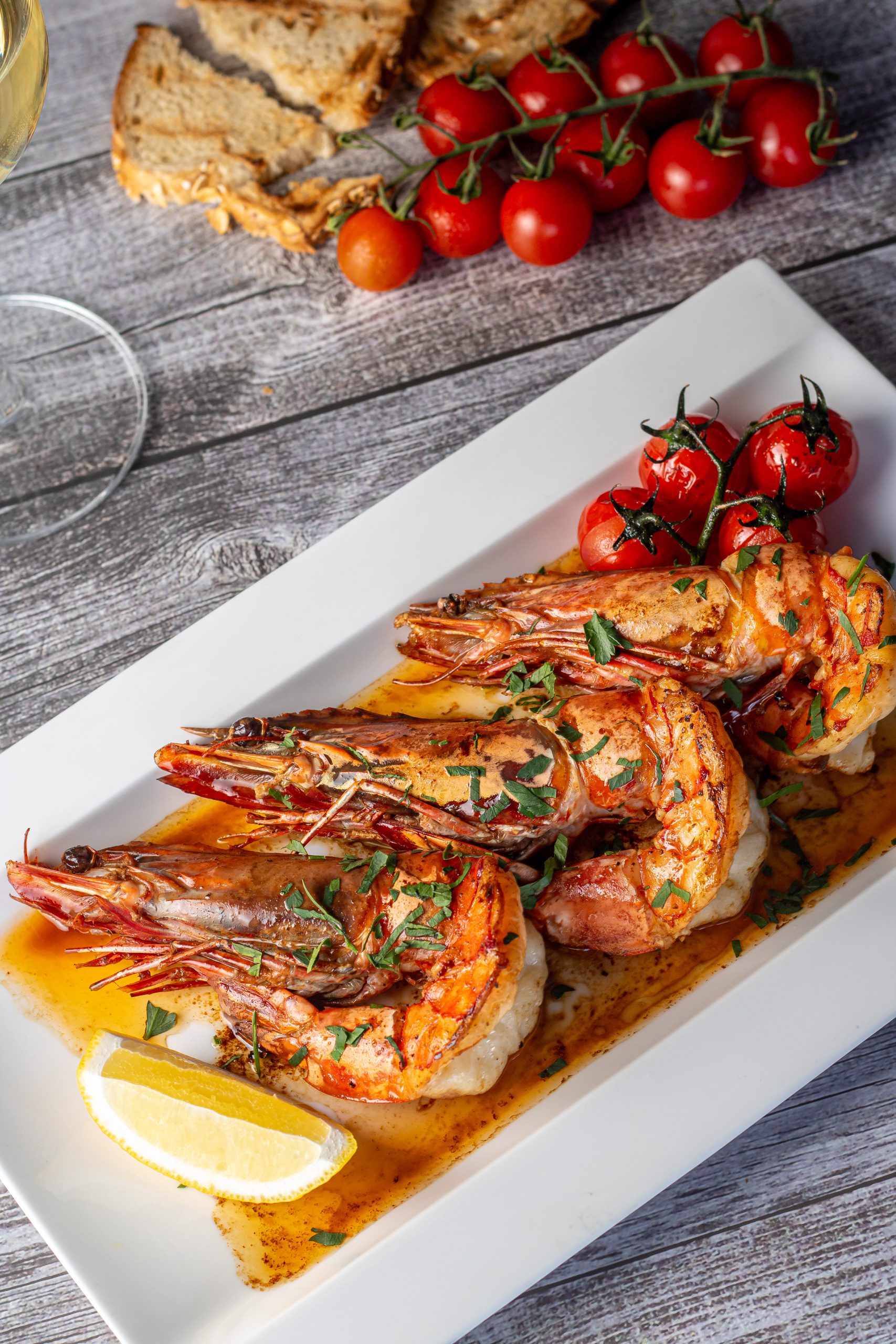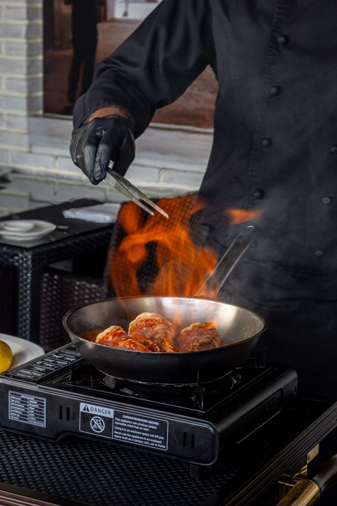 CHEF AL TAVOLO GAMBERONI FLAMBÉ AL COGNAC E LIMONE CHEF AL TAVOLO GAMBERONI FLAMBÉ AL COGNAC E LIMONE Succulent tiger prawns flambéed with cognac and finished with fresh lemon for a rich yet refreshing flavor, prepared live by our chef at your table. Available from 7th April for a limited time.