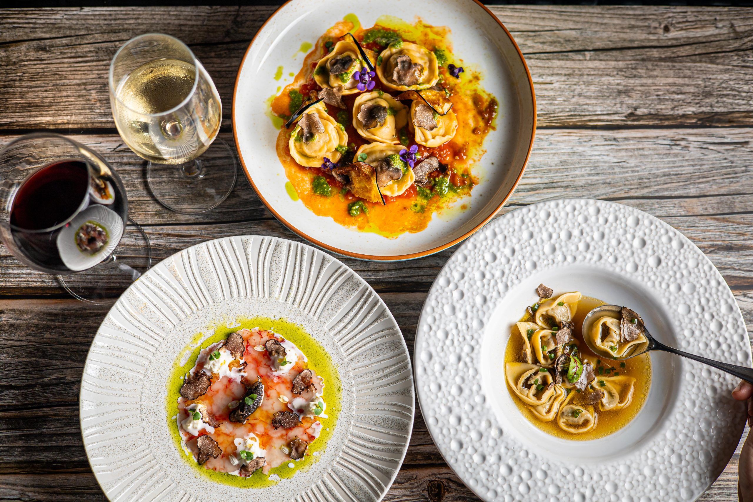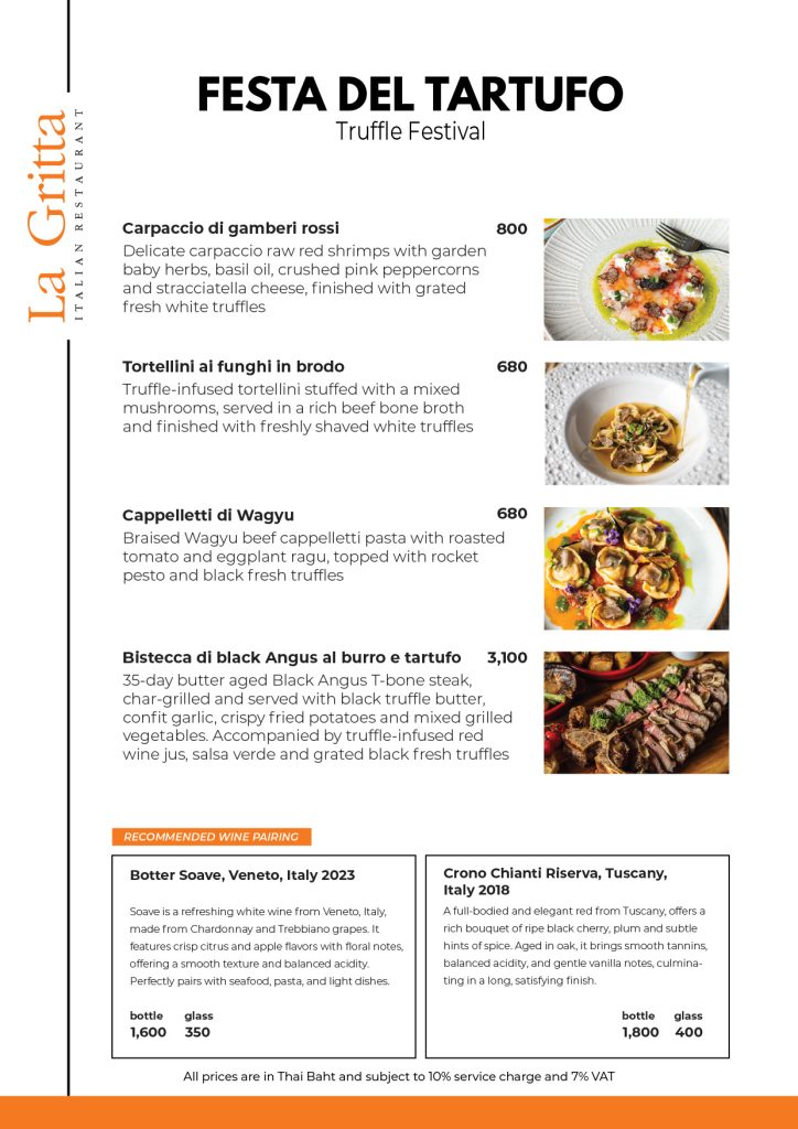 Celebrate the elegance of truffle season with dishes that highlight Italy’s most expensive ingredient. Indulge in delicate White and bold Black Truffles in dishes like Wagyu Cappelletti, Red Shrimp Carpaccio, and our signature Black Angus Steak for a tasteful and memorable experience.