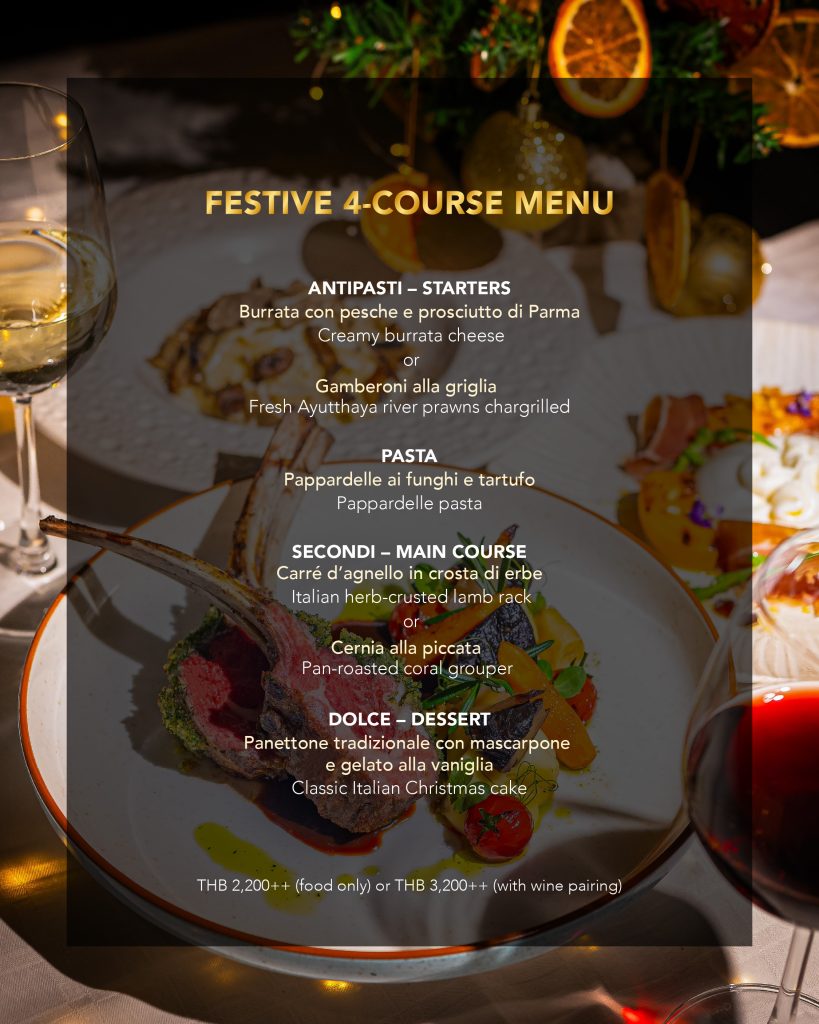 À la carte starts from THB 390++ per course, or enjoy a 4-course menu from THB 2,200++ (THB 3,200++ with wine pairings).